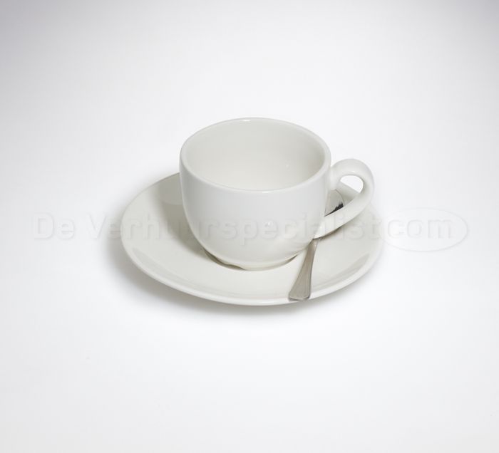 Ivoorkleurige kop en schotel van goede kwaliteit hotelporselein. Setje bestaat uit een kopje, schoteltje en koffielepeltje luxe.