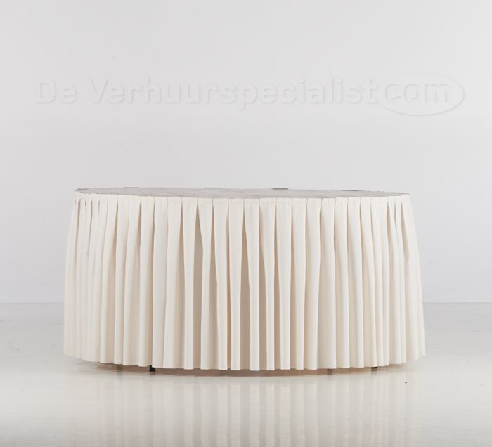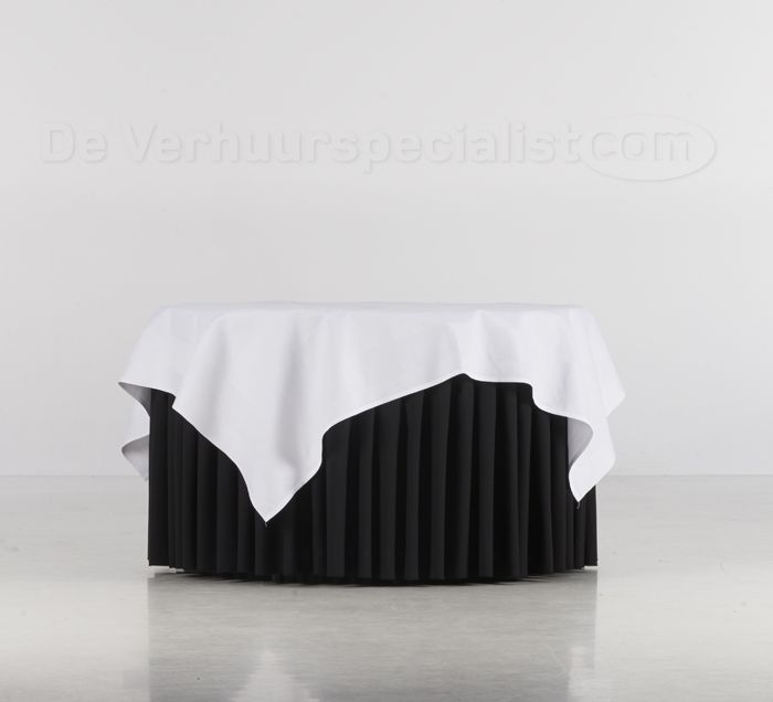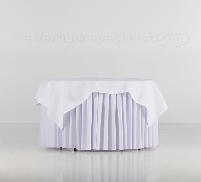 Uiteraard beschikken wij ook over het juiste formaat wit tafellinnen en kunnen wij deze tafel rondom voorzien van een stijlvolle afrokking welke in diverse kleuren leverbaar is.